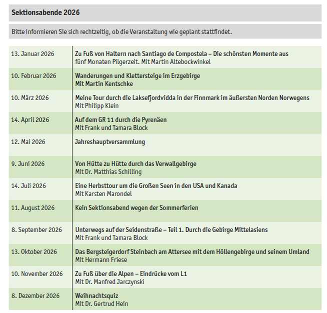 Jeweils am zweiten Dienstag des Monats finden unsere Sektionstreffen statt. Wir treffen uns ab 19.30 Uhr im Kolpinghaus in Recklinghausen, Herzogswall 38. Wir zeigen interessante Bildervorträge, meist von Mitgliedern unserer Sektion. Die genauen Termine und Themen entnehmen Sie der Terminübersicht (siehe unten). Meistens dauert die Veranstaltung bis 22:00 Uhr. Nach dem Vortrag sitzen wir oft in gemütlicher Runde zusammen und sprechen über unsere Berg-, Wander- und Klettererfahrungen. Interessierte Neumitlglieder und solche, die es werden wollen, haben die Möglichkeit, mit den verschiedenen Abteilungsleitern unserer Sektion zu sprechen und gezielt Fragen anzubringen.
